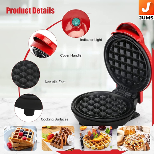 Power: 350 W — quick heating for small-batch cooking like waffles and snacks. Size: 4-inch cooking surface — makes 1 waffle at a time (good for singles or quick bites). 3-in-1 Function: Can make waffles, pancakes, and grilled sandwiches/snacks with the same unit (multi-use appliance). Non-Stick Plates: Non-stick coating for easy food release and wash-up.