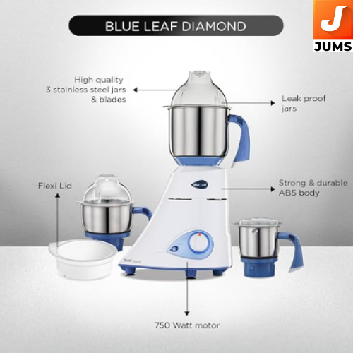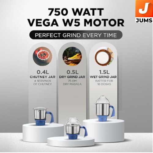 Powerful 750 W motor: Provides enough power for everyday grinding tasks like wet grinding, dry grinding, chutneys, and batters. Includes 3 jars: Comes with a 1.5 L wet grinding jar, 0.5 L dry grinding jar, and 0.4 L chutney jar — all made of stainless steel for durability and efficient grinding. Flexi lid feature: Flexible lid allows adjustment of jar capacity (e.g., a 1.5 L jar can be used as ~1 L), adding convenience and versatility. Stainless steel blades: Machine-ground, polished blades ensure quick and superior grinding performance even with tougher ingredients.