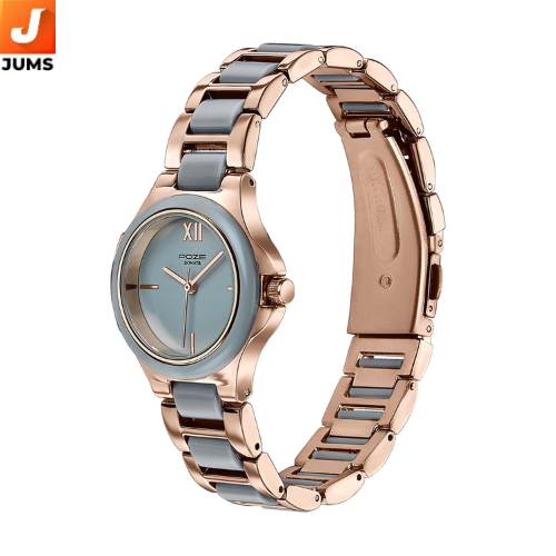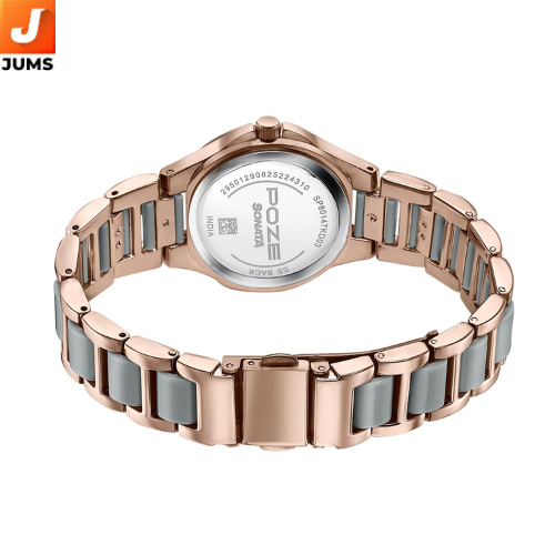 This Sonata Poze 7 women’s watch features a gray analog dial with a two-toned metal and plastic insert strap, offering a blend of contemporary casual style and everyday practicality. It has a quartz movement for reliable timekeeping and a sleek round metal case with mineral glass protection. The design is modern yet versatile, suitable for day-to-day wear and casual outfits, with a lightweight and comfortable build from Sonata’s Poze collection.
