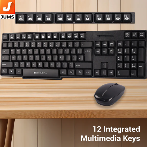ZEBRONICS Zeb Companion 115 is a 2.4 GHz wireless keyboard and mouse combo designed for basic home/office computing with straightforward connectivity and everyday functionality. The set includes a 104‑key full‑size wireless keyboard with 12 integrated multimedia keys, a dedicated ₹ (Rupee) key, power‑saving mode, and UV‑printed keycaps for increased durability. It pairs with a high‑precision ergonomic mouse with 3 buttons, 1200 DPI tracking, and a nano USB receiver that connects both devices wirelessly with up to about 10 m range (without obstacles)