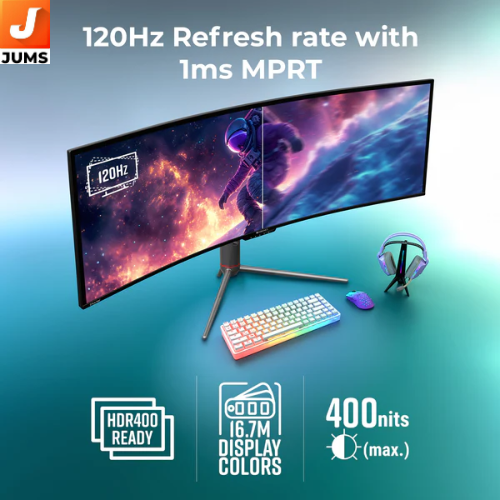 49″ Ultrawide Curved Screen: Large 1800R curved panel with an immersive 32:9 aspect ratio for a wide, panoramic view. High Resolution (DQHD): 5120 × 1440 pixels for crisp visuals and extensive workspace. HDR400 Ready: Enhanced contrast and dynamic image quality for richer visuals. Anti-Glare Coating: Reduces reflections to help with eye comfort during long usage. Wide Colour Coverage: Approx. 99 % sRGB and 95 % DCI-P3 for vibrant and accurate colour reproduction